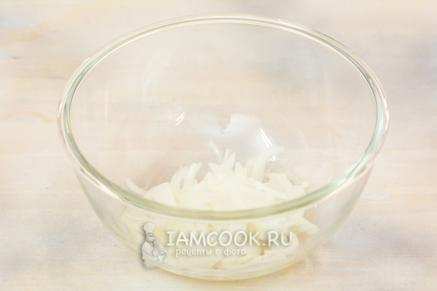 Лук нарежьте произвольно (у меня - перьями), добавьте уксус.