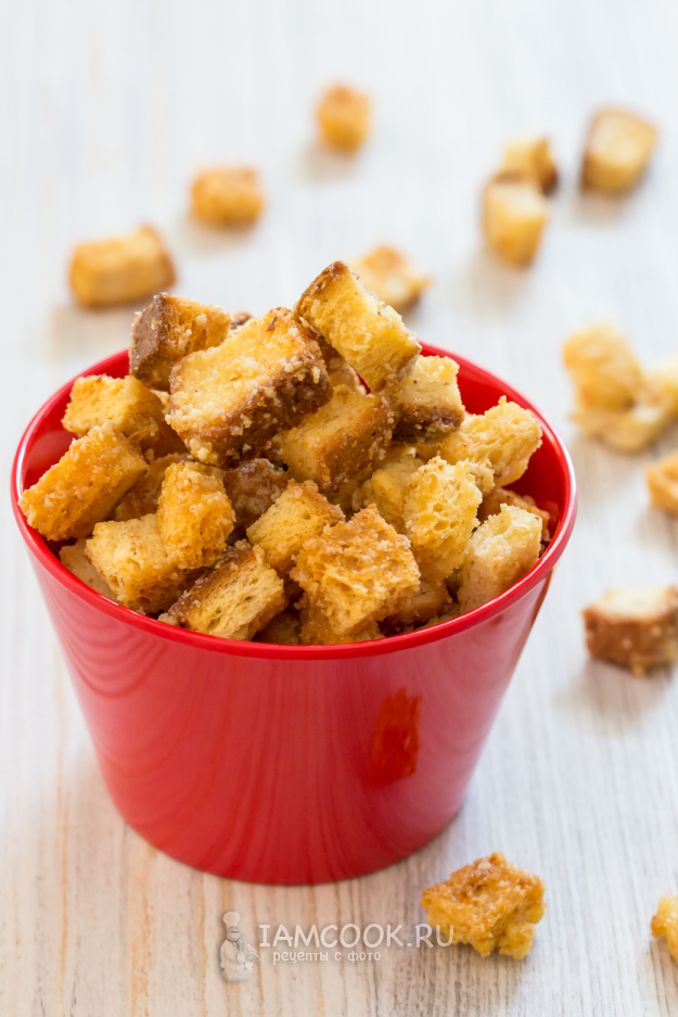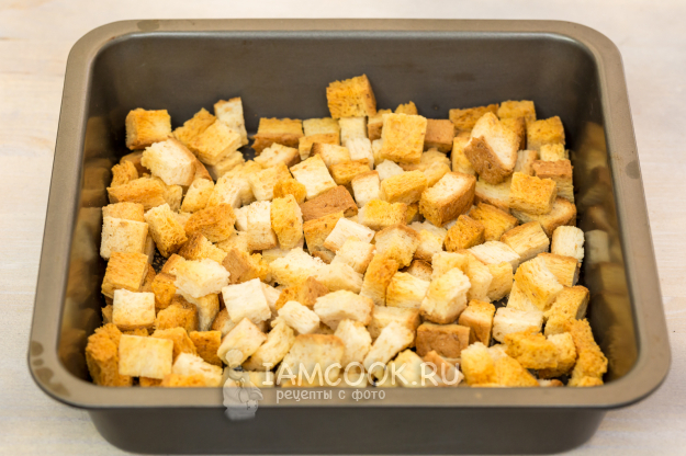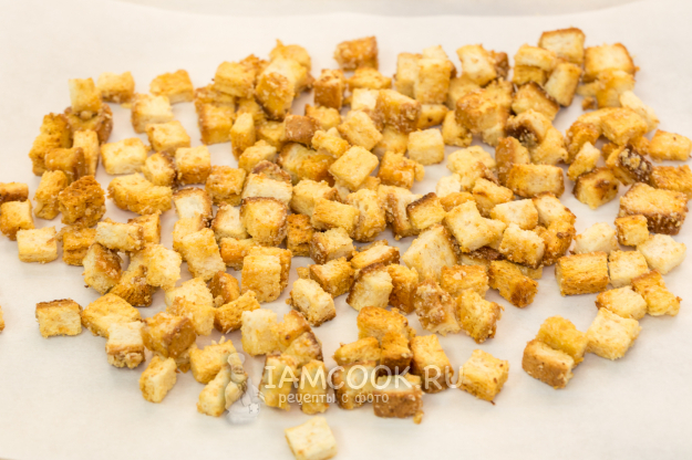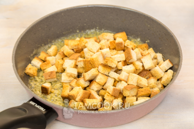 Хлеб нарежьте мелкими кубиками и доведите в духовке до состояния сухариков.