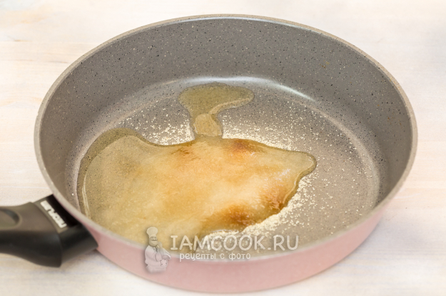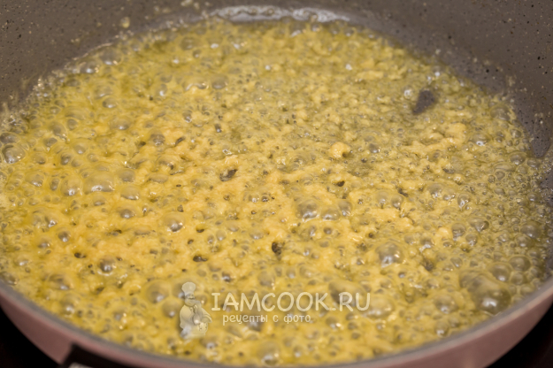 В сковороде смешайте сахар и воду. Поставьте на плиту и доведите смесь до кипения. Сахар при этом должен раствориться.