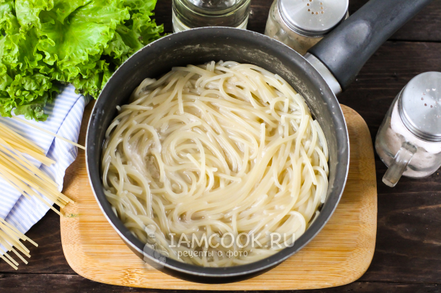 Вскипятите в казане или кастрюле воду, посолите ее и выложите спагетти, другой вид пасты. Отварите то количество времени, которое указано на упаковке, - оно может варьироваться от сорта макарон.