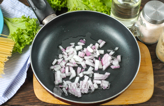 Очистите лук от кожуры, промойте в воде и нарежьте мелкими кубиками. Допустимо заменить красный лук репчатым, луком-пореем. Раскалите сковороду с растительным маслом и добавьте луковую нарезку. Обжарьте примерно 2-3 минуты до румяности.
