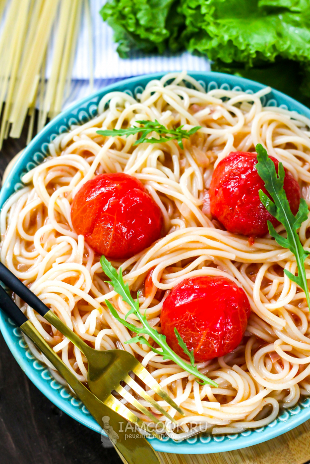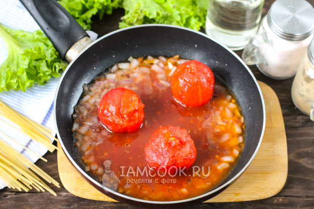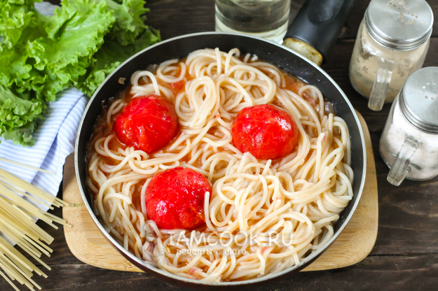 В томатную массу выложите отваренные спагетти, отцедив их от бульона. Аккуратно перемешайте и протомите примерно 1-2 минуты.