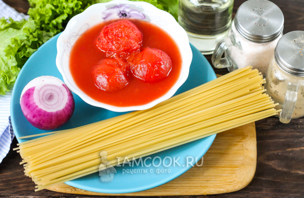 Подготовьте ингредиенты для пасты (макарон) с томатами в собственном соку и начнем кулинарить!