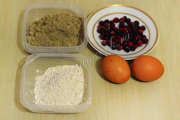1. Необходимые продукты: льняная мука, овсяная мука (у меня перемолотые в кофемолке овсяные хлопья), клюква, яйца куриные, разрыхлитель, ванилин, соль и мед (также прекрасно получается со стевией).