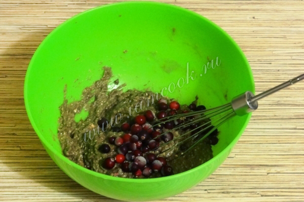 5. Добавить кипяток, перемешать до исчезновения комков. Добавить овсяную муку и ванилин и еще раз перемешать. Вмешать осторожно клюкву.