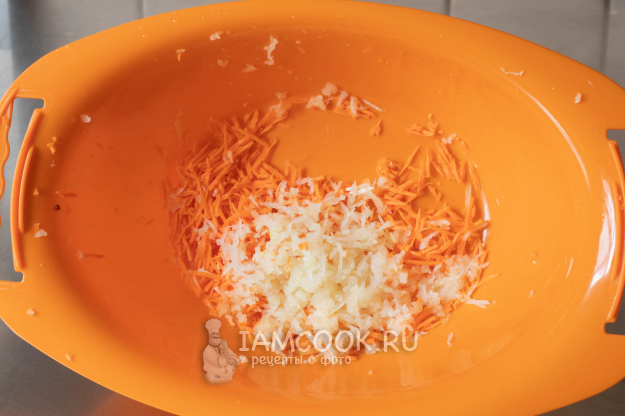 Пока он варится, мелко режем лук и морковь (или трём последнюю на крупной тёрке).