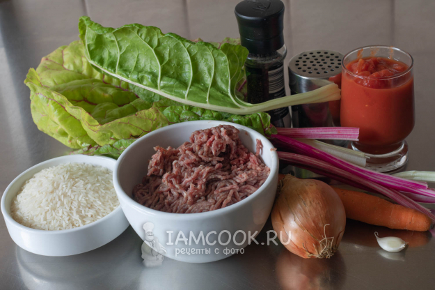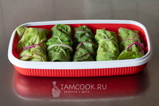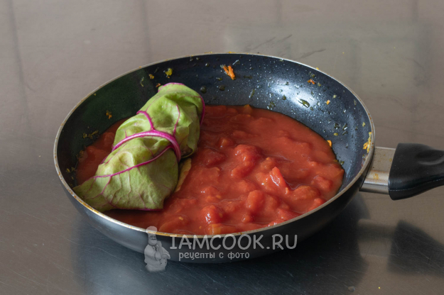 Заполняем сковороду томатным соком или помидорами в собственном соку. Заворачиваем фарш в листья мангольда и укладываем кончиком листа вниз на сковороду.