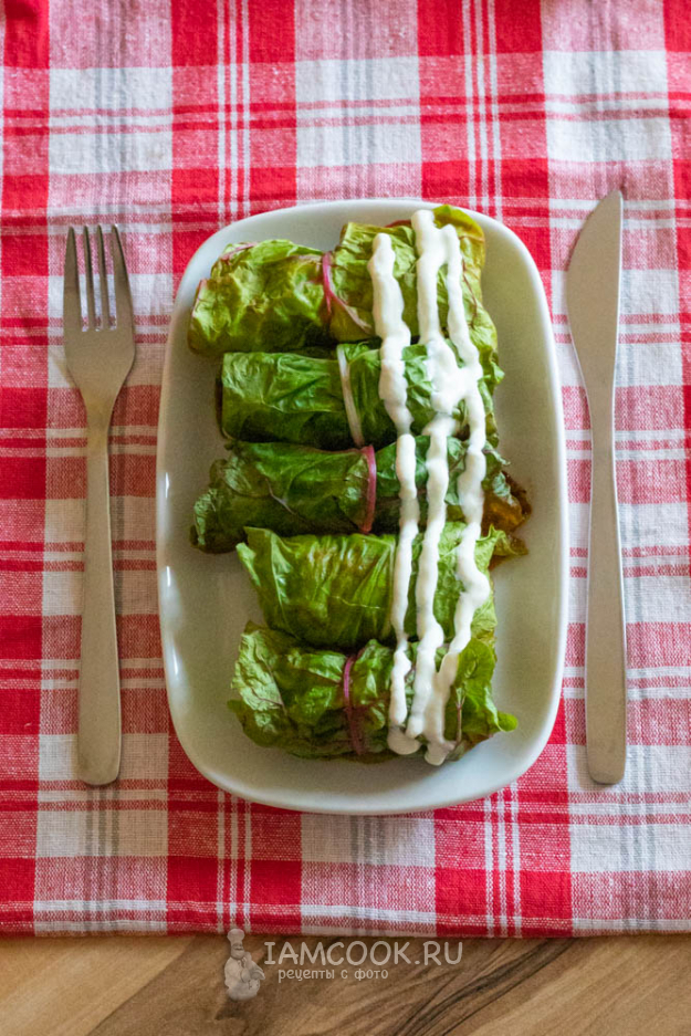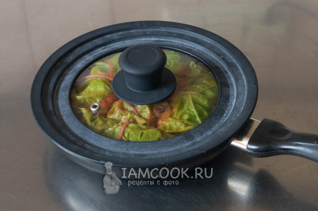 При этом способе приготовления голубцы в листьях мангольда следует тушить под крышкой на среднем или слабом огне 20-25 минут с момента закипания томатной массы.