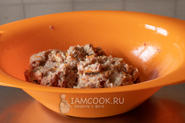 Остывший рис и продавленный через чесночный пресс зубчик чеснока тщательно смешиваем с фаршем.