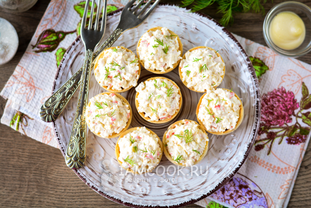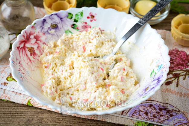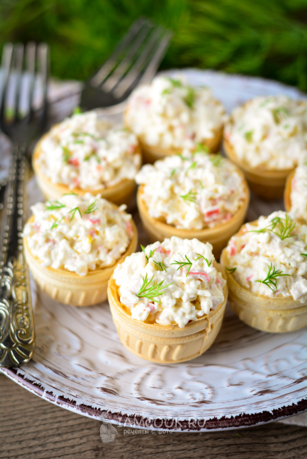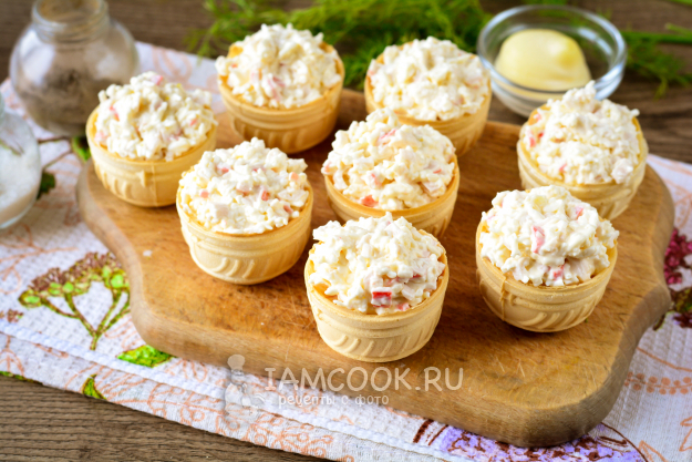 Наполните вафельные тарталетки крабовой начинкой. На каждую тарталетку уйдет 1,5-2 чайных ложки, чтобы сформировалась горка. Когда начинки много - будет вкуснее.