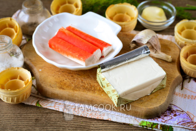 Подготовьте нужные ингредиенты для тарталеток с крабовыми палочками и плавленым сыром. Заранее разморозьте крабовые палочки и очистите их от упаковочной пленки. Купите вафельные тарталетки - они хрустящие, вкусные и недорогие.