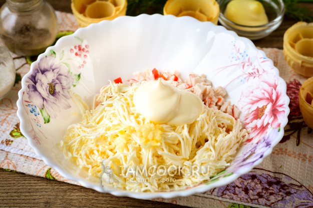 Добавьте майонез в начинку, слегка посолите и поперчите.