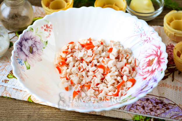 Крабовые палочки нарежьте мелкими кубиками, так начинка получится более однородной. При желании можете натереть их на терке.