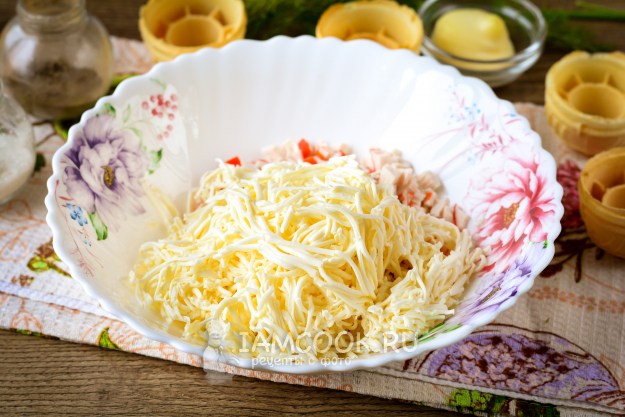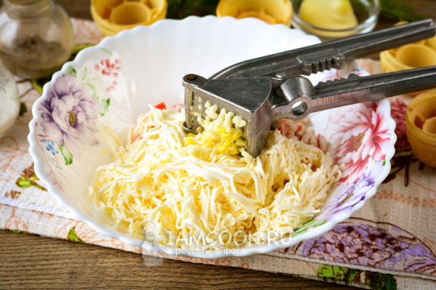 Натрите на терке плавленый сырок, у меня был сырок "Дружба". Можете плавленый сыр заменить на обычный твердый сыр, но с плавленым начинка будет более нежной, как крем.