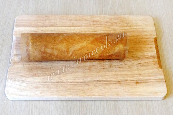 10. Свернуть опять в рулет, завернуть с бумагу или пищевую пленку и дать пропитаться в холодильнике 1-2 часа.