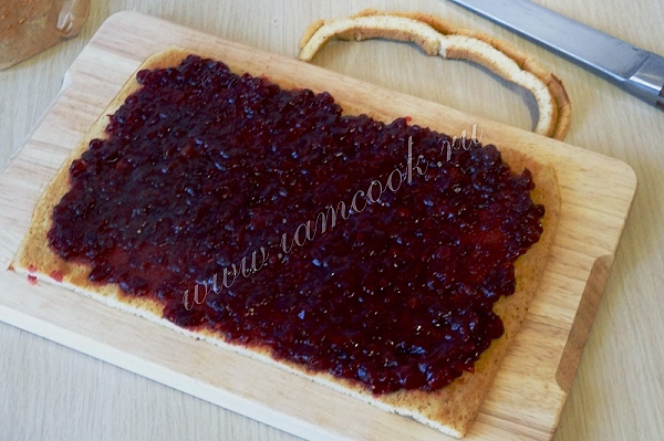 9. Остывший корж развернуть, снять бумагу и обрезать края. Хорошо промазать начинкой.