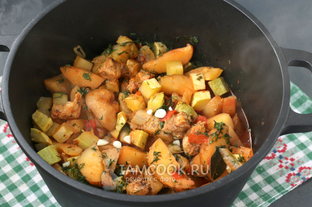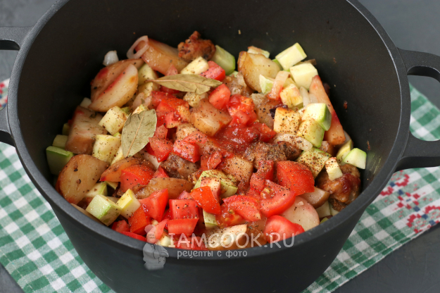 Нарезать такими же кубиками помидор и добавить в казан. Если у помидора грубая шкурка, то его лучше предварительно бланшировать. Рагу посолить и поперчить, добавить лавровый лист. Разбавить водой томатную пасту и полить этим соусом овощи сверху.