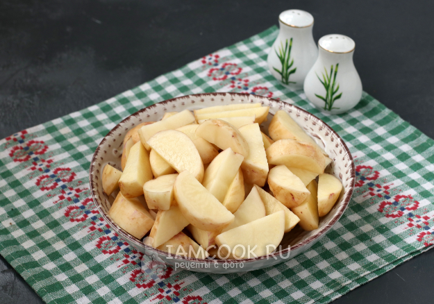 Картошку помыть, почистить и нарезать крупными ломтиками. Молодую картошку можно не чистить, а хорошо вымыть губкой для мытья посуды.