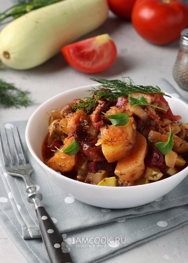 Разложить рагу по порциям и подать к столу, посыпав свежей зеленью.