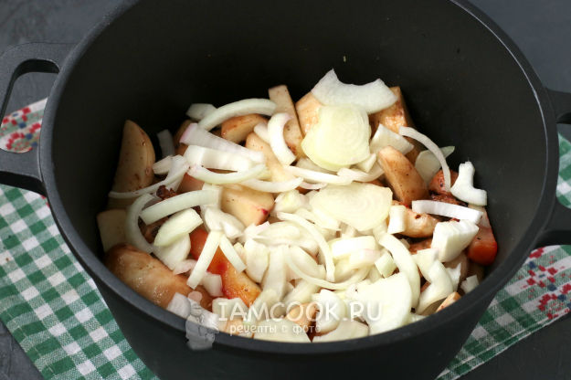 Почистить лук и нарезать его полу- или четверть-кольцами. Добавить в казан и готовить 3-5 минут.