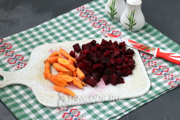 Затем добавить свеклу с морковью и готовить ещё 10 минут, немного убавив огонь.