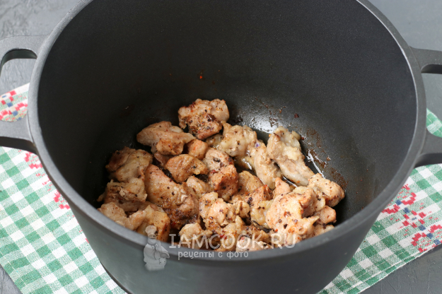 В казане разогреть растительное масло, добавить свинину и жарить до румяной корочки на среднем огне, помешивая, около 15 минут.