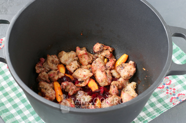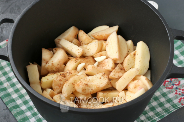 Добавить в казан картофель и часть чеснока, поперчить и продолжать готовить ещё 10 минут, немного перемешивая.
