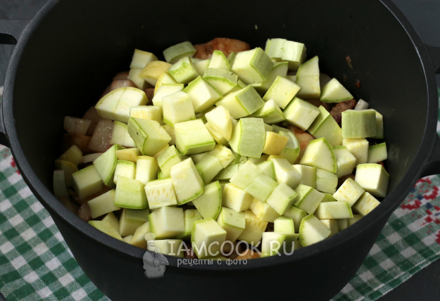 Кабачок нарезать кубиками, добавить в казан вслед за луком.