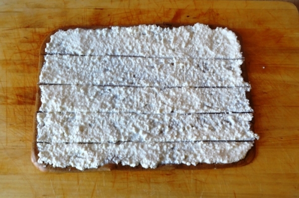 10. На корж нанесите практически весь крем, оставив 2-3 ст.л для украшения. И разрежьте корж по длине на одинаковые полосы.