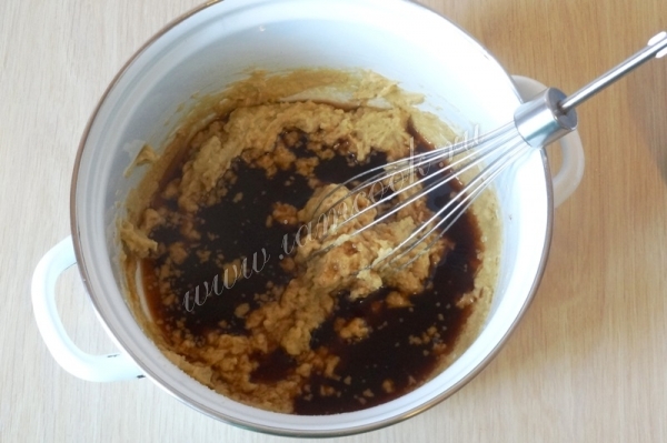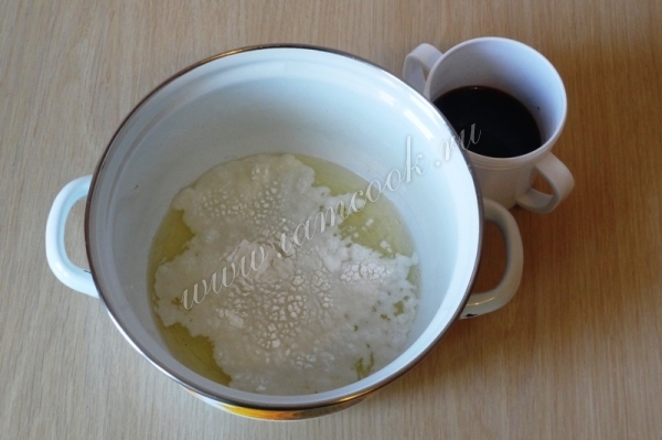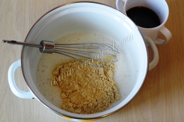 3. Разрыхлитель должен вспениться. Добавьте сахар и взбейте белки в легкую пену. Растворите кофе в воде.