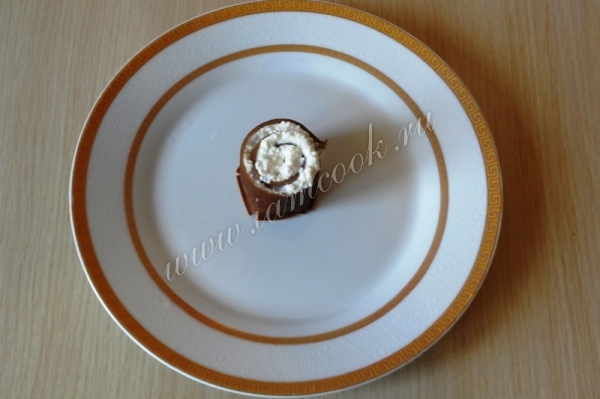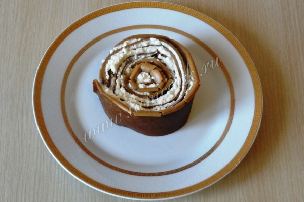 11. Сверните одну полоску рулетом и установите на тарелку вертикально.