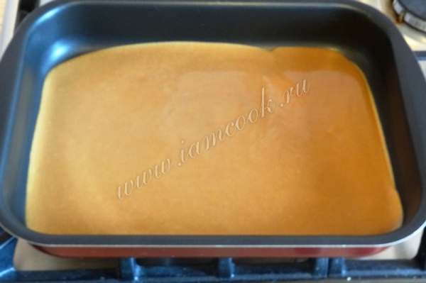 7. Вылейте тесто на противень тонким слоем. Выпекать в разогретой до 160-180 градусов духовке минут 10-15.
