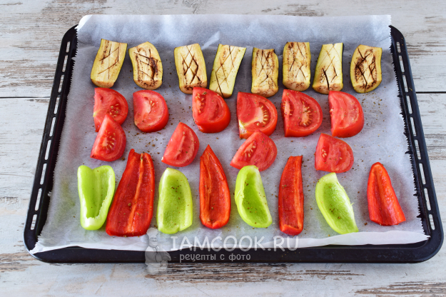 Противень застелем бумагой для выпечки и выложим овощи в один слой. Посыпаем овощи небольшим количеством уцхо-сунели. Отправляем в разогретую до 180-190°С духовку на 15-20 минут. Поглядывайте на овощи в это время, помидоры пропекутся быстрее, их нужно будет достать раньше.