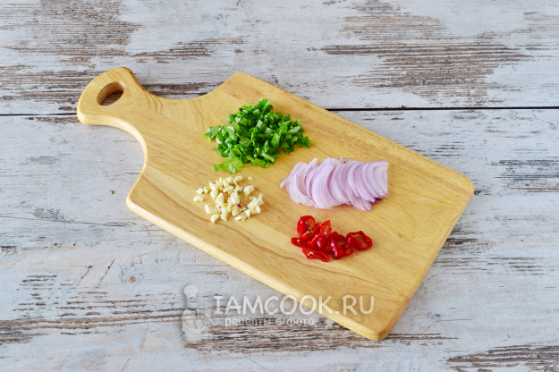 Кинзу, базилик (у меня его не оказалось) мелко рубим ножом. Чеснок также измельчаем. Лук репчатый нарезаем пером, а острый перец чили - колечками.