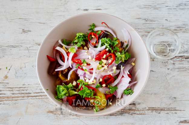 Выкладываем всё к овощам, добавляем винный уксус и всё хорошо перемешиваем. Даем блюду настояться в холодильнике от 30 минут.