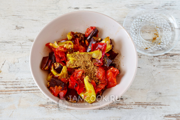 Готовые овощи достаем из духовки. Если хотите снять с овощей кожицу, тогда сразу горячими переложите овощи в целлофановый пакет и герметично закройте. Дайте овощам минут 10 там побыть и затем открывайте пакет и снимайте кожицу с овощей. Я этого не делала. Выложила все овощи в миску, добавила оставшуюся специю уцхо-сунели.