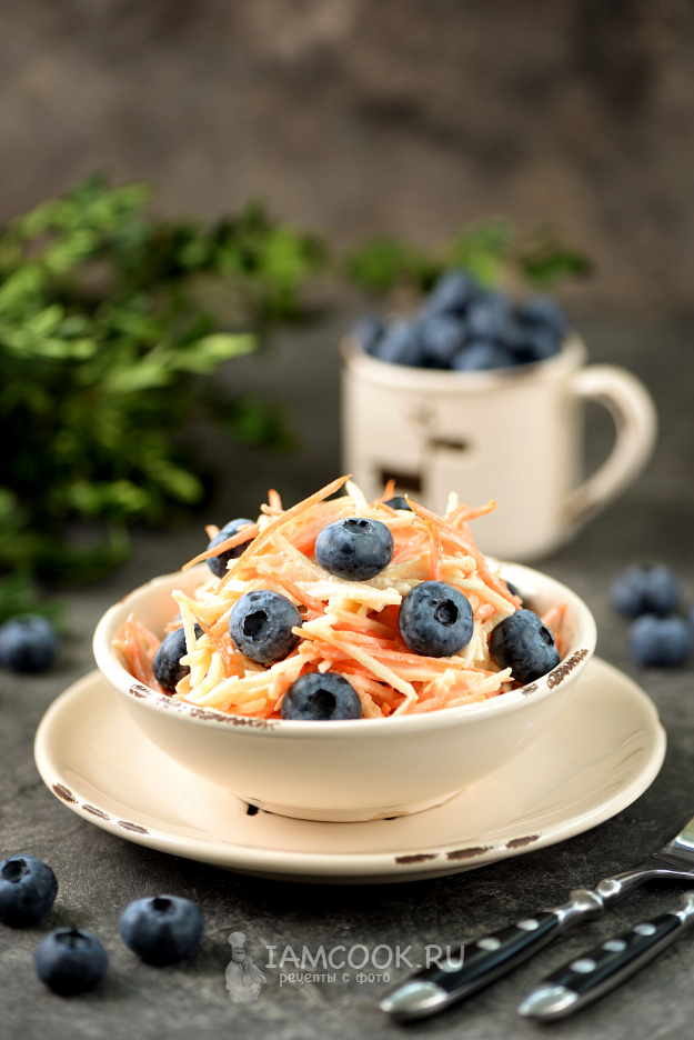 Очень вкусный и сочный витаминный салат из моркови с яблоком и голубикой подавайте минут за 30 перед основной трапезой, чтобы все витамины усвоились организмом.