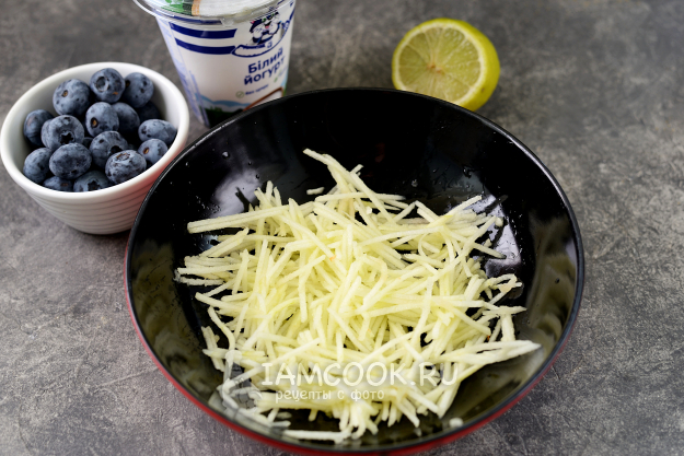 Очистите яблоко от кожуры и семечек, натрите на любой удобной терке, полейте соком лимона или лайма, чтобы яблоко мгновенно не почернело от соприкосновения с металлической теркой.