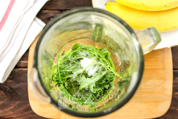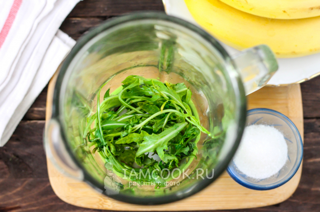 Промойте рукколу в воде, разобрав пучок. Встряхните листья, удаляя лишнюю влагу, и выложите в чашу блендера или в глубокую емкость, если будете измельчать все погружным блендером.