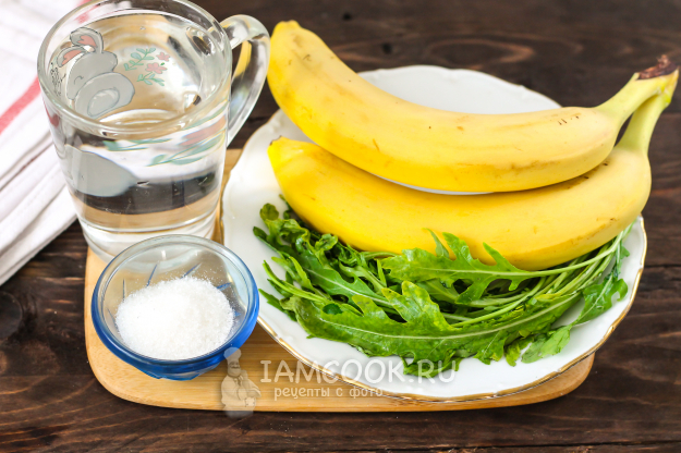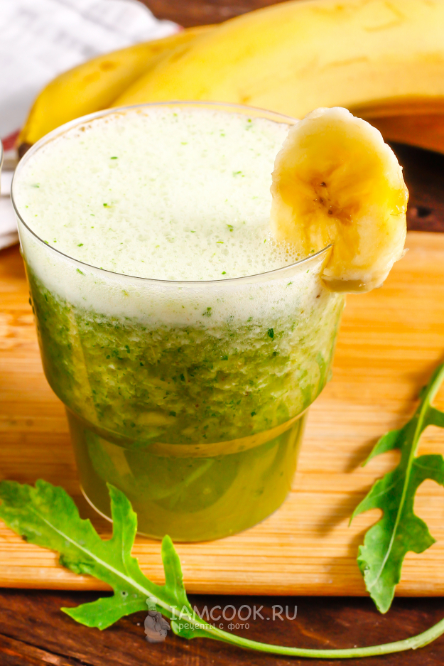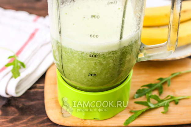 Перелейте зеленый смузи из рукколы с бананом в стаканы или чашки, украсьте по вкусу и сразу же подайте к столу, так как напиток может быстро расслоиться.