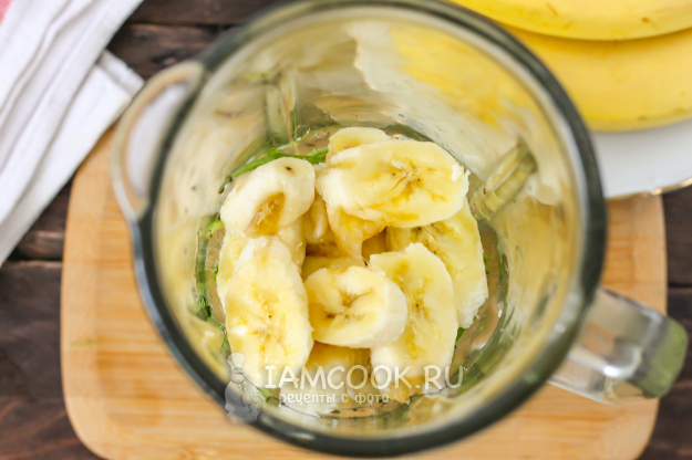 Очистите банан от кожуры, нарежьте ломтиками и добавьте в емкость. В летнее время можно добавить 2-4 кубика льда, чтобы напиток получился холодным, освежающим на вкус.