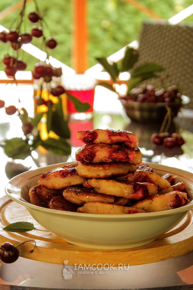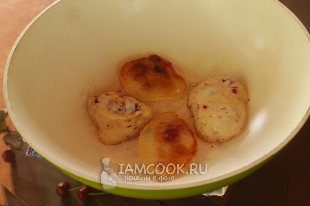 Поддевайте тесто сверху и жарьте оладьи с вишней на раскаленной сковороде с добавлением растительного масла, с двух сторон.