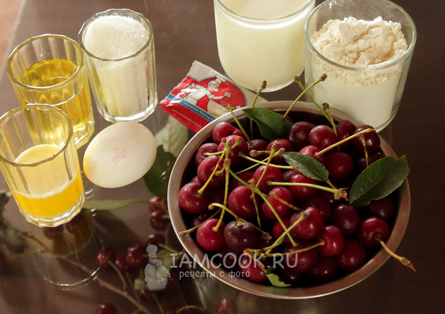 Подготовьте продукты для оладий с вишней на молоке. Вымойте вишни. Если нужно, уберите гнилые, сухие, удалите косточки и отбросьте ягоды на сито. Растопите и остудите сливочное масло. Количество сахара можно изменить по своему вкусу, также в сладкое тесто зачастую бросают щепотку соли.