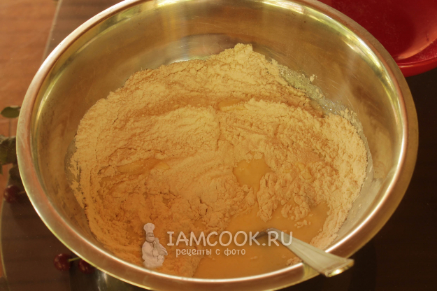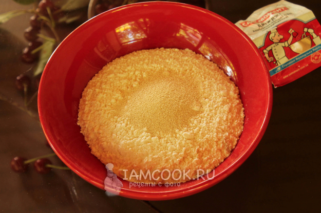 Сухие дрожжи перемешайте с мукой. Одну-две ст.л. муки оставьте для панировки вишни.