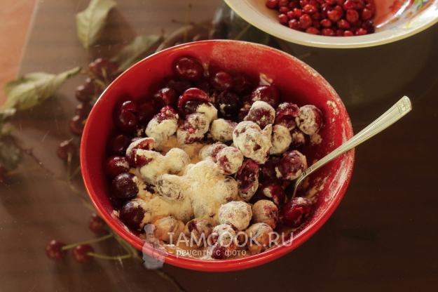 Вишни без косточек и лишнего сока запанируйте небольшой порцией муки.
