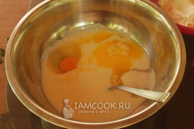 В другой емкости взболтайте чуть теплое молоко, растопленное сливочное масло, сахар и яйцо.