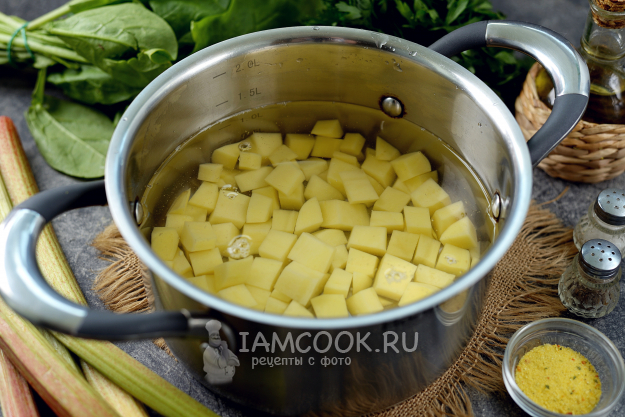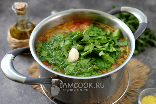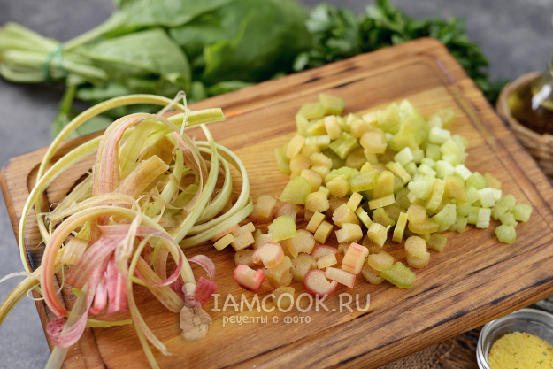 Поскольку щи у нас из ревеня, то добавление капусты не подразумевается. Мы положим в суп нарезанный крупно шпинат и раздавленный зубчик чеснока. Варить суп на этом этапе следует не дольше 2 минут, чтобы сохранить все полезные вещества. За это время бульон следует посолить и поперчить, добавить универсальную приправу, конечно же, без гмо и с припиской "органик". Также на этом этапе вы поймете, следует ли добавлять сахар. Если ревень свежайший, то он будет очень кислым, но решать вам.