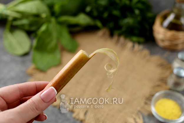 Ревень нужно очистить от волокнистой оболочки. Проще всего это сделать следующим образом: надрежьте слегка посередине стебель ревеня и сломайте его пополам. Волокнистая верхняя часть очень легко будет отделяться от стебля, достаточно всего лишь за нее потянуть. С других сторон все это легко сделать с помощью кухонного ножа.