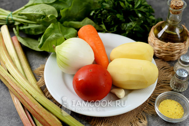 Подготовьте продукты для зеленых щей из ревеня и шпината. Лук, картофель, морковь и чеснок почистите, помойте с остальными овощами под проточной водой.