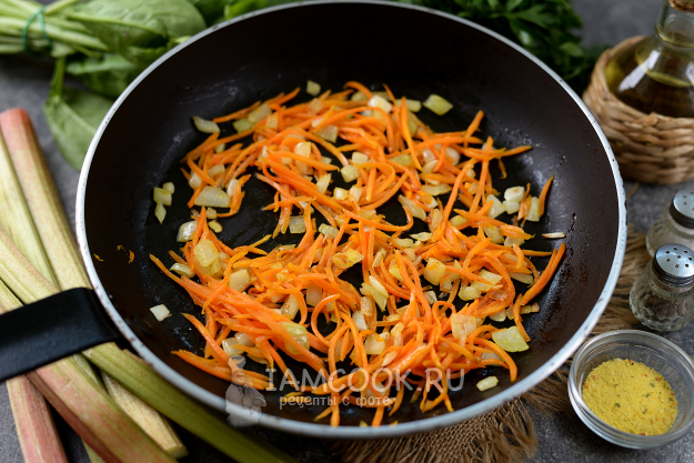 В это время в минимальном количестве растительного масла обжарьте нарезанный мелким кубиком лук и тонко нашинкованную морковь. Жарьте на среднем огне минуты 3-4, овощи должны стать прозрачными и сладкими.